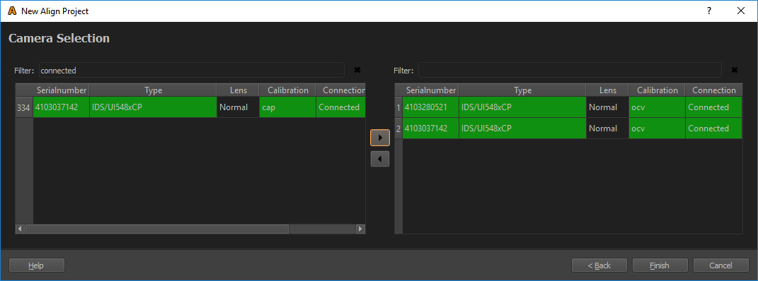 Select cameras in the left list that should be used in the align project. The list can be filtered for connected cameras, by enetring ”connected” in the filter.