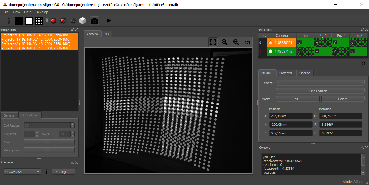 Align allows to re-align drifts in already calibrated, fixed installed projection systems, using digital cameras and a high degree of automation (support for multiple fixed installed cameras or a camera on rotation unit). Align generates new data that is the basis for Mapper2d/Mapper3d to calculate updated warping and blending information.