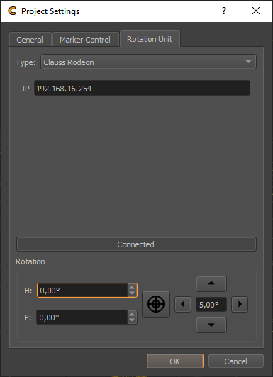 Project Settings.../Rotation Unit allows to setup and test communication with an installed rotation unit.