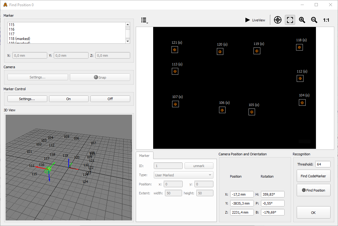 This will take new images and calculate the camera position. If the settings where correct you’ll get orange circles with a cross inside for all markers.
