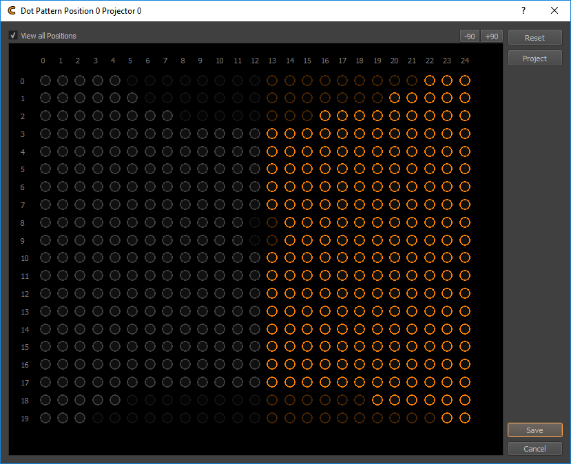 Reset the dot pattern mask by enabling all dots again. Or if a dot pattern for a distinct camera position is edited, the mask will be reset to the global projector mask.