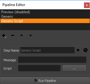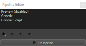The pipeline editor is used to configure one or multiple exporters and scripts with persistent settings. All steps configured in the pipeline editor can be run in the defined order by pressing the “Run Pipeline” button.