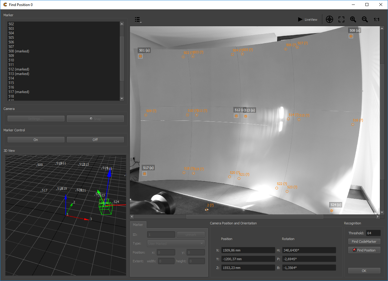 If problems occur, e.g not enough markers detected or camera position implausible, check recognition parameters threshold and thresh avg. Than hit “Find Position” again.