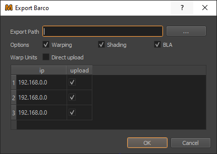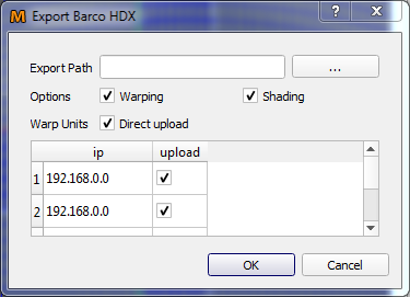 Enter the ip address of each projectiondesign WB, so that export can be directly uploaded. If a warp unit is unchecked it will be excluded from the direct upload.