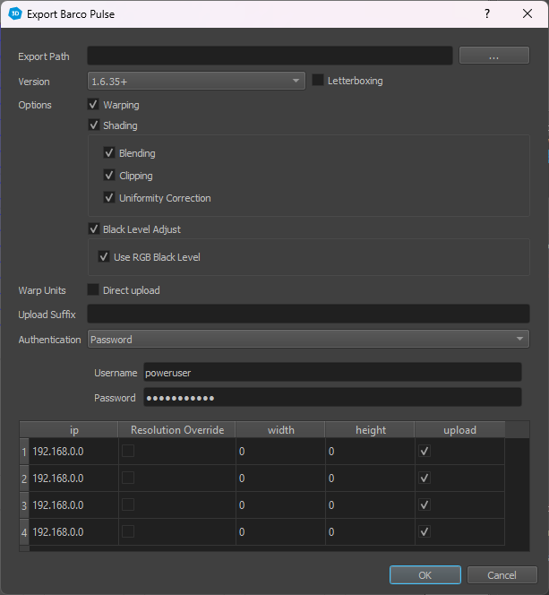 The Barco Pulse exporter supports export of warping, blending and black-level adjustment for Barco Pulse platform projectors, such as the F70 and F90.