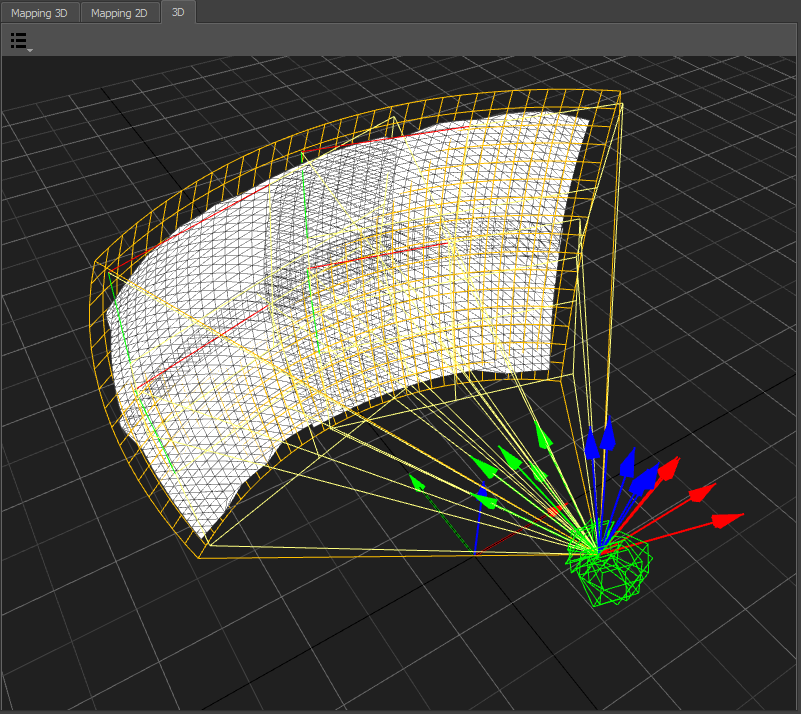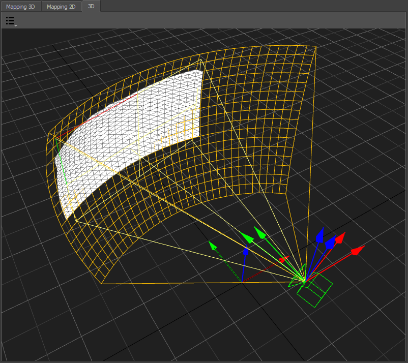 Represents the current Mapping-settings. It shows the screen-shape and iconic projection-rays at the corners of the screen. In addition the projection of the measured points onto the screen are visualized.