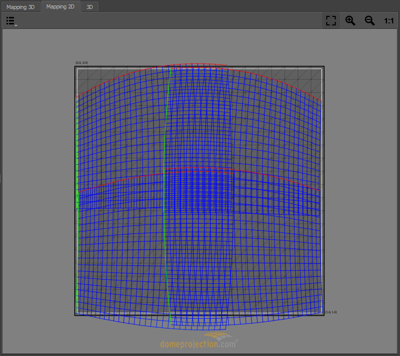 The Mapping 3D view shows how 3D content rendered with virtual cameras is warped for each channel. The warping is represented as a distorted mesh in normalized projector chip coordinates ranging from (0,0) top-left to (1,1) bottom-right.