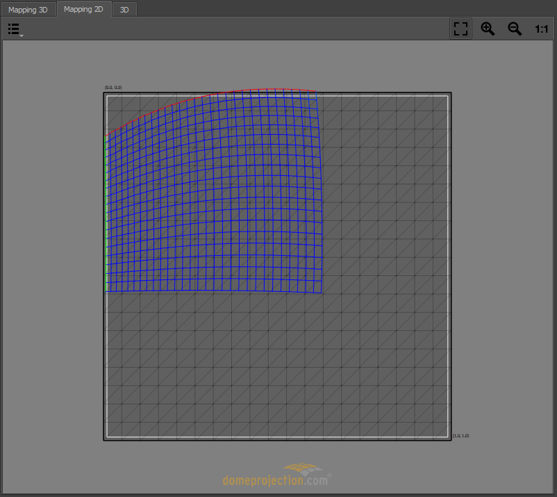 The Mapping 2D View Shows the texture space, a normalized space ranging from (0,0) top-left to (1,1) bottom-right. It defines how 2d content is mapped onto the screen. This mapping is used for fadeout, clipping and blending calculations.