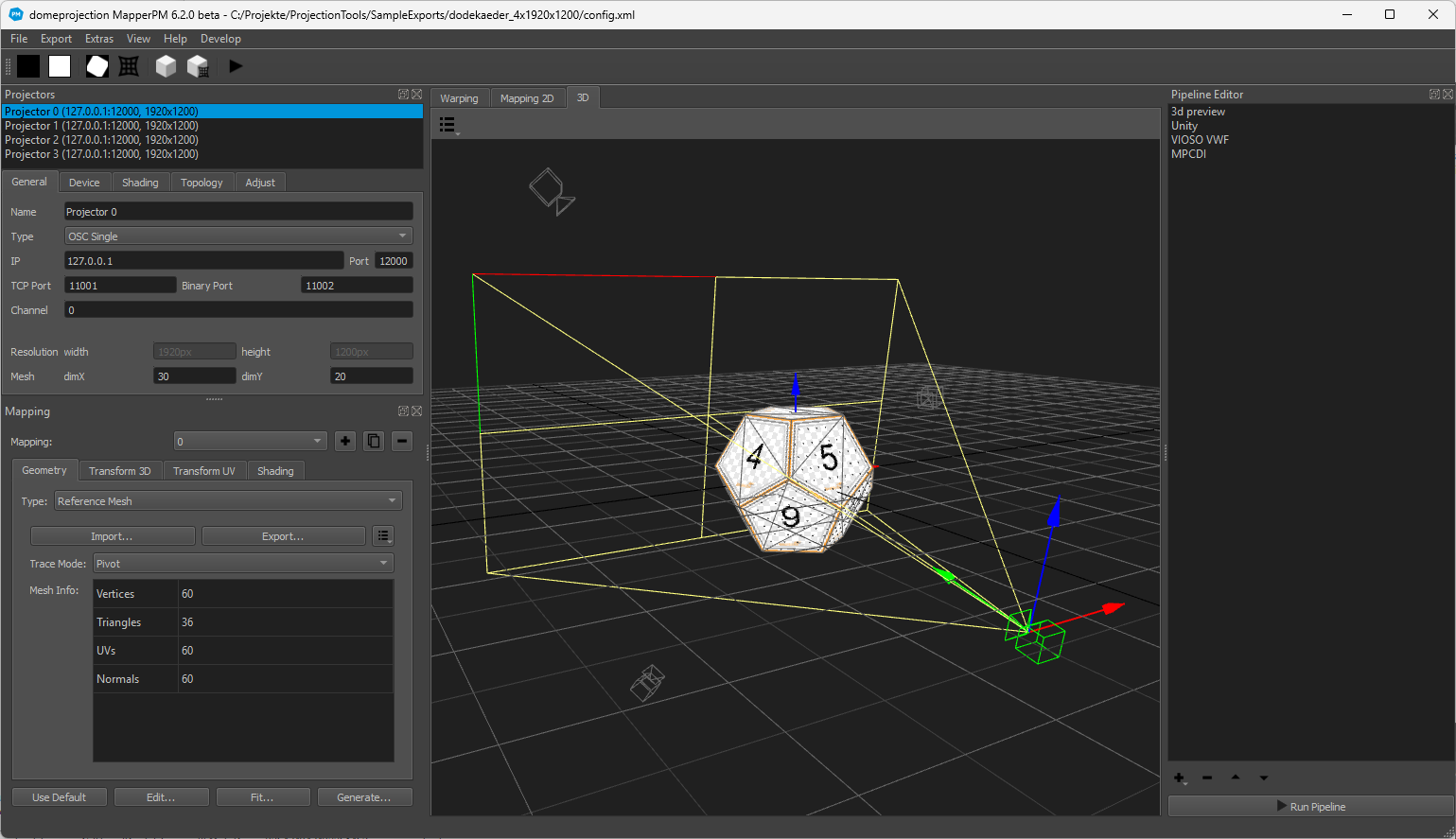 The 3d view window shows the measured screen, mapping visualization and currently selected projectors in 3d space.