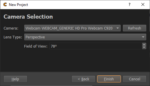On the last wizard page, select a connected camera to be used for calibration, then set its lens type and opening angle / Field of View.