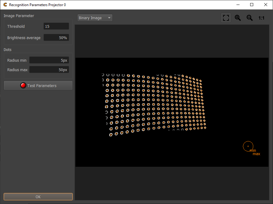 If not all of the fully projected points are detected, adjust the threshold and dot min/max radius and test the new parameters again to improve the detection.